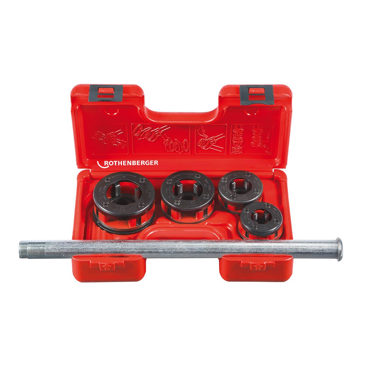 For manual pipe threading of pipes from ½” – 1 ¼” with ratchet handle. Easy to use on fixed pipes. Contents Ratchet handle and Die heads from ½” to 1 ¼”